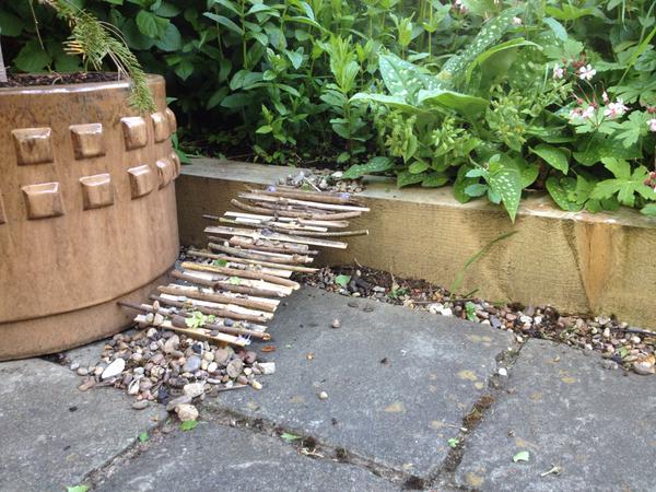 Not only do you need to provide the right flowers, it's also very important to make a 'insect hotel' in which they can protect themselves from the elements. Solitary bee hotels are exceptionally easy to make…you can either fill a empty jar/tin with hollow bamboo poles, or you can drill holes into blocks of wood. For mine I used a section of tree trunk and drilled varying diameter holes into the flat end using a handheld drill. On top of the trunk I layered bamboo poles on top to make the hotel stand better chances of getting a vacancy!